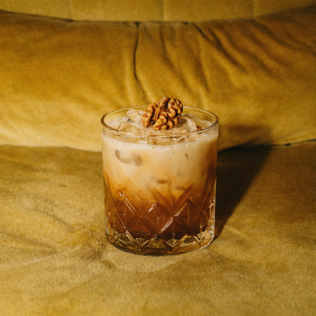 Prepare a short glass with ice. Pour the coffee directly over the ice, allowing it to chill slightly. Gently add a small amount of Sotol cream, letting it naturally blend with the coffee without fully mixing. Stir softly to achieve a smooth, velvety texture. Finish by garnishing with a walnut or a subtle aromatic touch, and serve immediately.